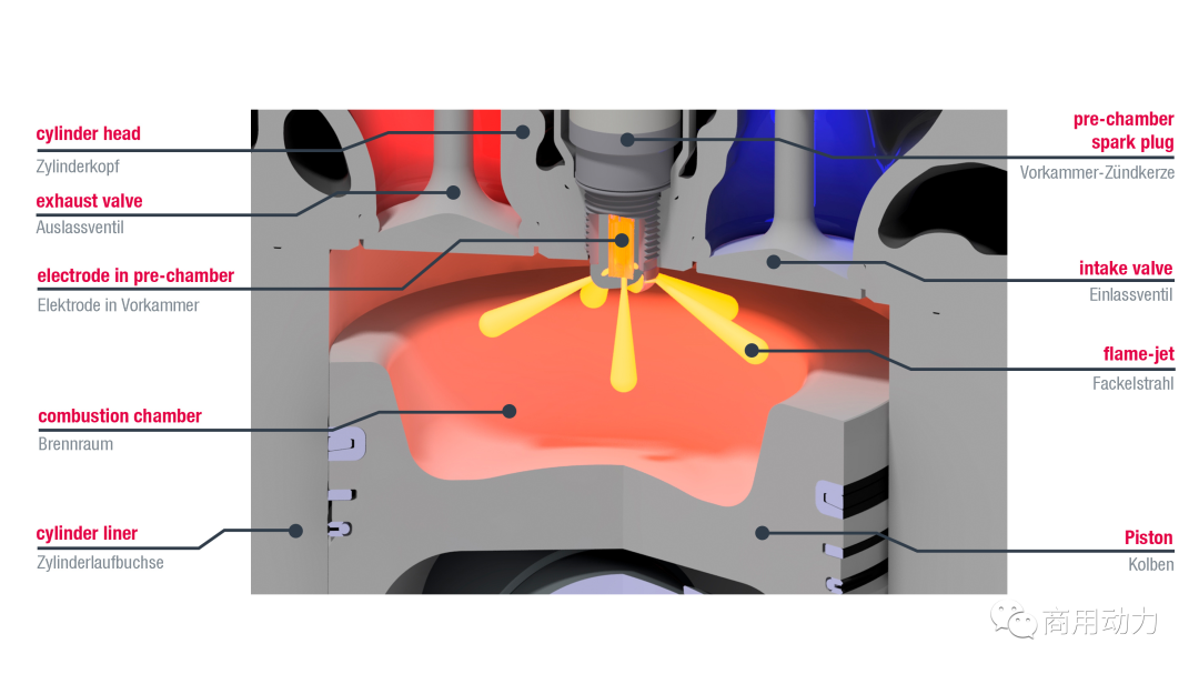 此外,帶有預(yù)燃室火花塞的MAN發(fā)動(dòng)機(jī)具有更好的燃燒質(zhì)量:預(yù)燃室火花塞配有徑向排列的孔,可提供與主燃燒室的連接。在壓縮階段活塞向上運(yùn)動(dòng)期間,可燃?xì)怏w-新鮮空氣混合物通過(guò)孔進(jìn)入預(yù)燃室,在那里被點(diǎn)燃。由于結(jié)構(gòu)和結(jié)構(gòu)設(shè)計(jì),主燃燒室中的燃?xì)?空氣混合物可以被預(yù)燃室逸出的高能火焰射流更好地點(diǎn)燃,從而可以安全地點(diǎn)燃稀薄混合物。預(yù)燃室中的最佳點(diǎn)火是通過(guò)幾個(gè)排列成星形的點(diǎn)火源實(shí)現(xiàn)的?!笆褂妙A(yù)燃室火花塞,我們可以將系統(tǒng)效率提高多達(dá)一個(gè)百分點(diǎn)。